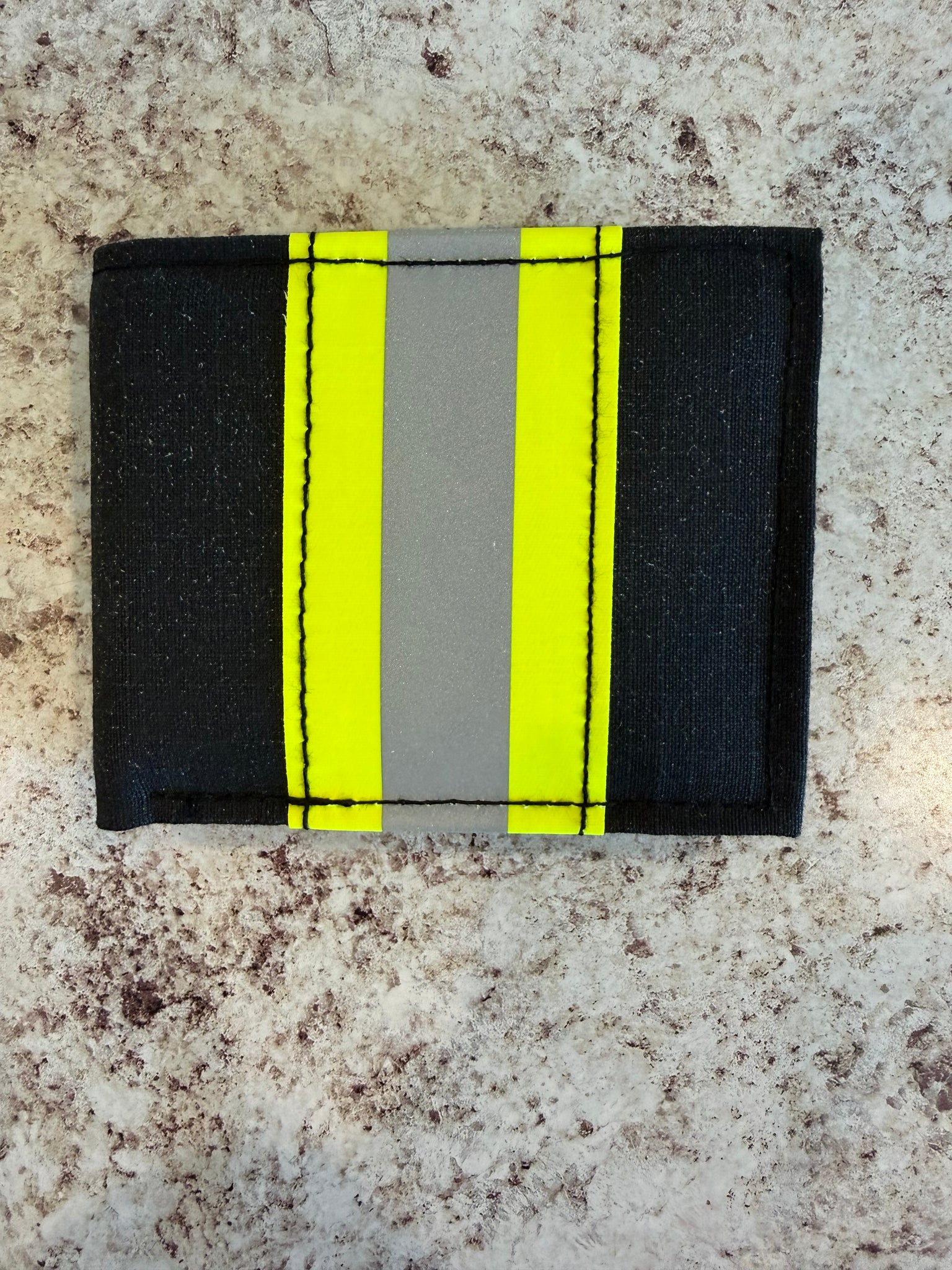 This wallet is made with authentic turnout gear material on top of genuine leather. It is made from all NEW material so it is clean and safe. Features a reflective stripe.